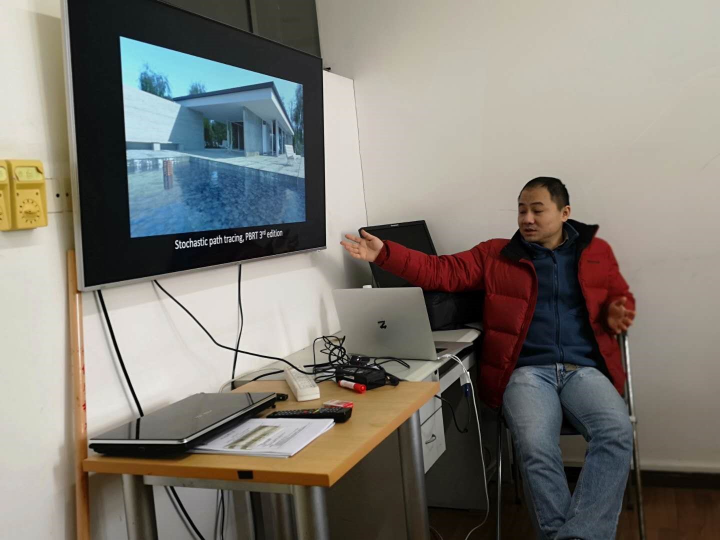 王锐教授是国际知名的图形渲染专家,他的报告从面向真实感绘制的光场低秩性开始,到自优化的绘制流水线架构设计,最后又介绍了正在研究中的云-端结合的实时高保真绘制引擎,这与我们艰辛探索多年的云烘焙在线全局光照渲染引擎的研究路线不谋而合。王老师系统地介绍这些年在高真实感实时渲染技术的研究成果,而且多以图像及视频展示,形象生动,令人印象深刻。王教授的报告大大开阔了同学们的学术视野,也大大激发了实验室同学们对图形渲染领域研究的兴趣,互动热烈,踊跃提问题,王老师总是耐心而睿智地回答。讲座结束之后同学们主动上前与王教授继续探讨,下午实验室的同学们也分别介绍了各自的研究,王老师也都提出了很多宝贵的指导意见和许多的鼓励。最后双方就共同合作方向进行了热烈探讨。此次学术报告与学术交流活动堪称圆满。