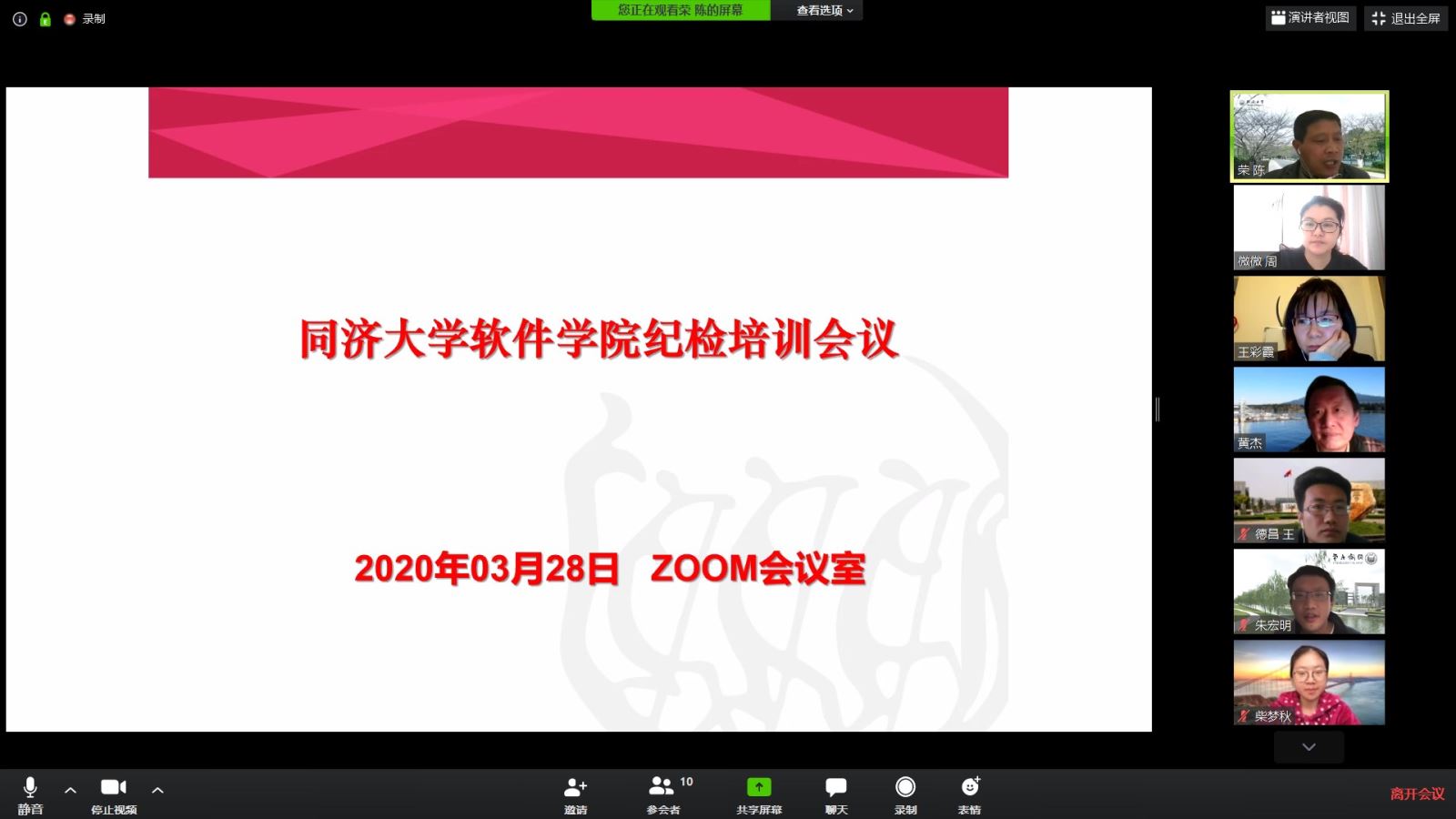 2020年3月28日上午,公司通过zoom平台召开了纪检工作培训会议,学院纪委委员、各支部纪检委员参加了本次会议,公司党委组织员、工会委员列席了会议。会议由公司党委副书记兼纪委书记陈荣同志主持。