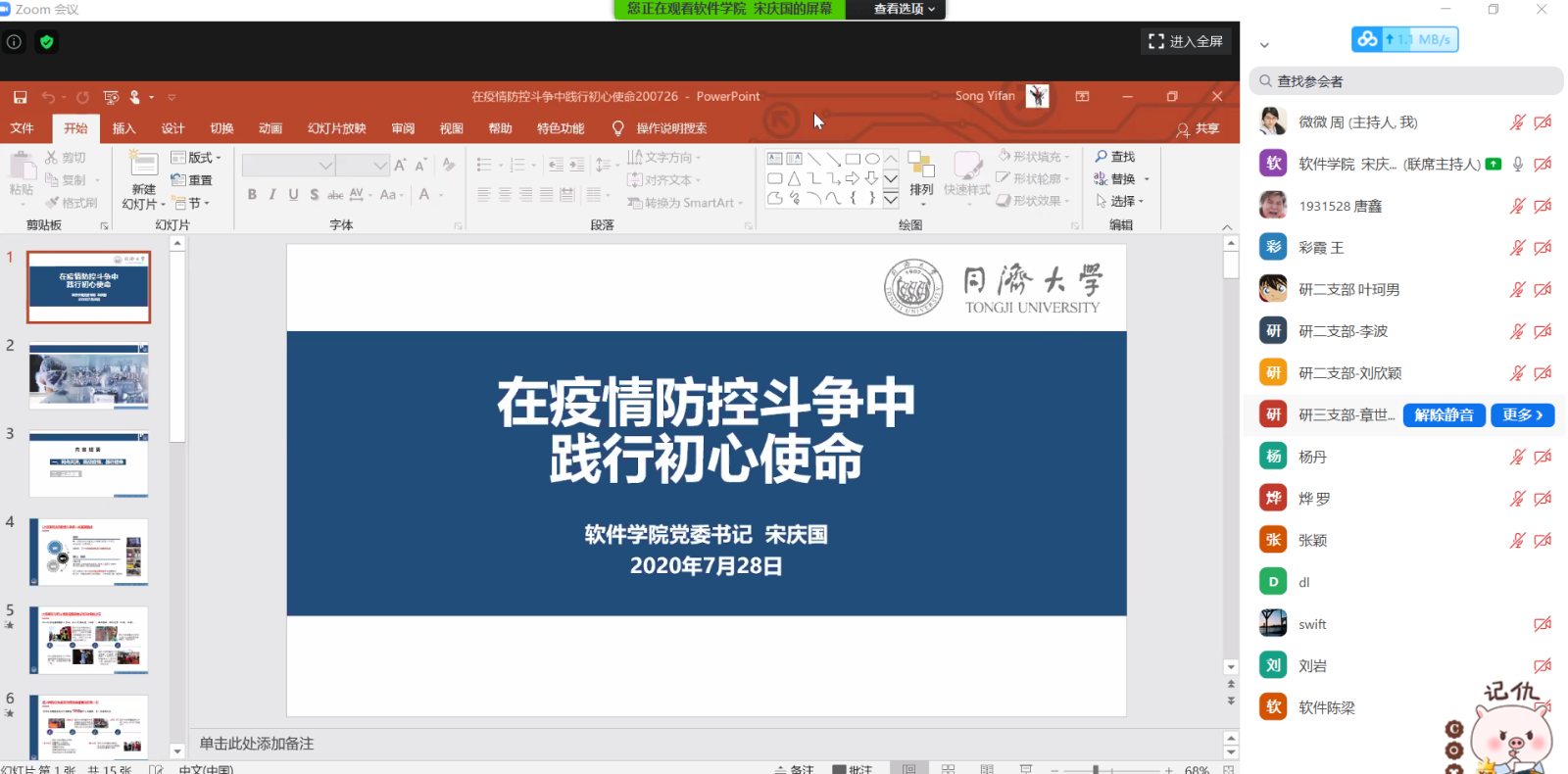 2020年7月28日下午,软件公司党委书记宋庆国同志通过zoom为软件学院全体党员上了题为“在疫情防控斗争中践行初心使命”的党课,学院全体师生党员参加。