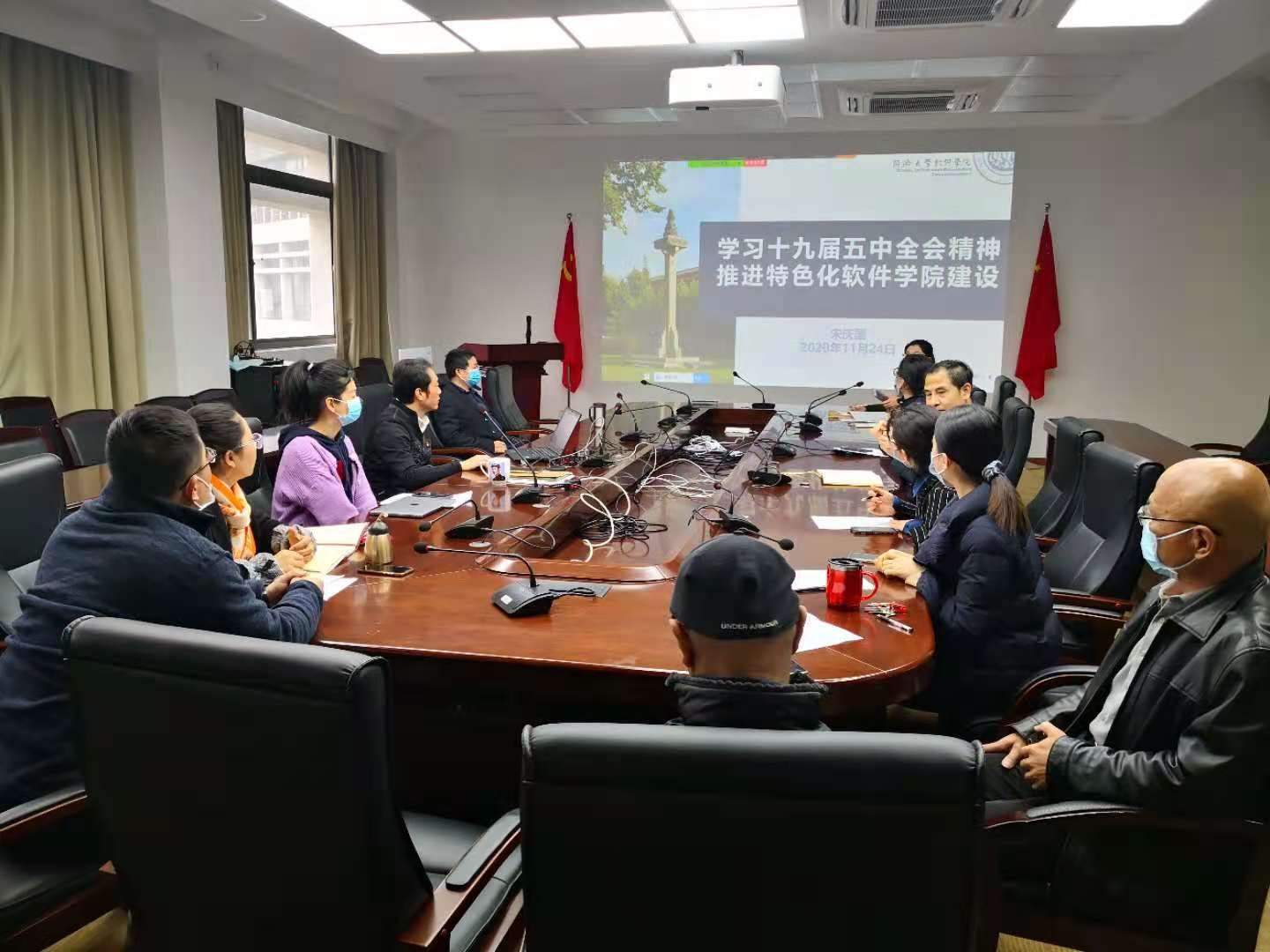 2020年11月24日下午,软件学院组织全体教师在济事楼417室集体学习十九届五中全会精神,公司党委书记宋庆国同志作了题为《学习十九届五中全会精神,推进特色化软件学院建设》的报告。部分教师和员工党员通过ZOOM聆听了报告。