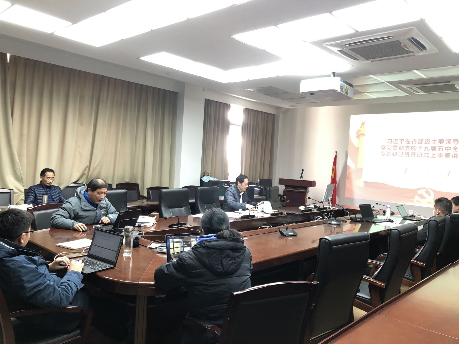 本次中心组学习《习近平在省部级主要领导干部学习贯彻党的十九届五中全会精神专题研讨班开班式上重要讲话》。首先,宋庆国书记通过PPT,从战略判断、机遇挑战、理论内涵、“双循环”新发展格局、党的领导等方面进行了解读,并作为2021年全党第一课,要求大家进一步精读细研,领会精神实质。随后,党委副书记兼纪委书记陈荣同志作了题为《把握新发展阶段、贯彻新发展理念,做好新时期从严治党工作》的主旨发言,接着大家就学习内容,尤其是如何扎实推进学院高质量发展作了深入的交流。