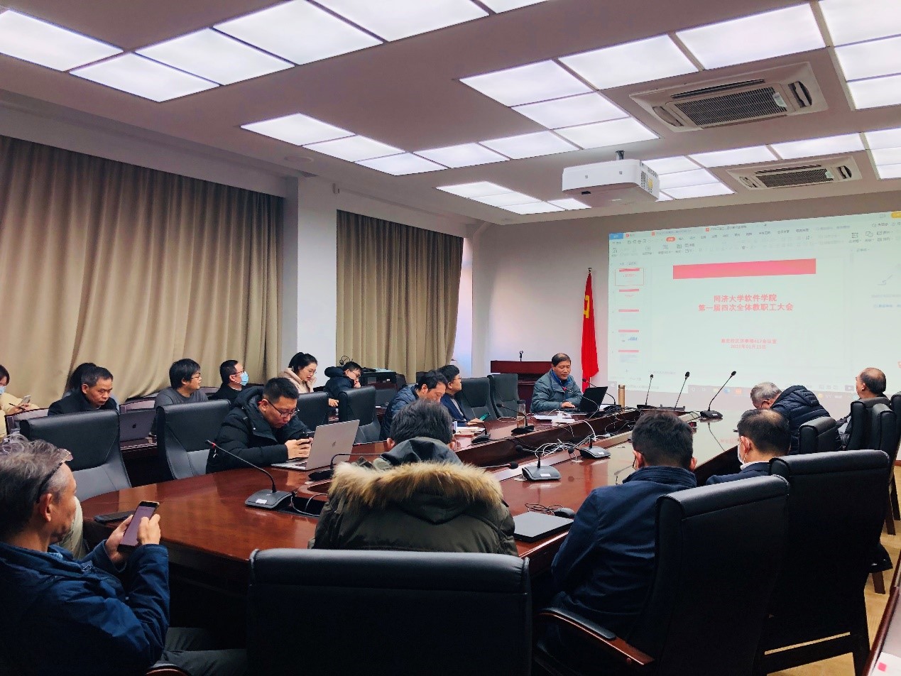 2022年1月11日下午,软件学院在嘉定校区济事楼417会议室召开第一届教职工代表大会第四次会议。学院领导、全体教职工参加会议,会议由公司党委副书记、工会主席陈荣同志主持。