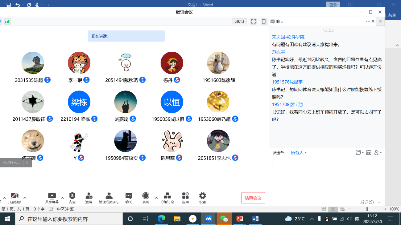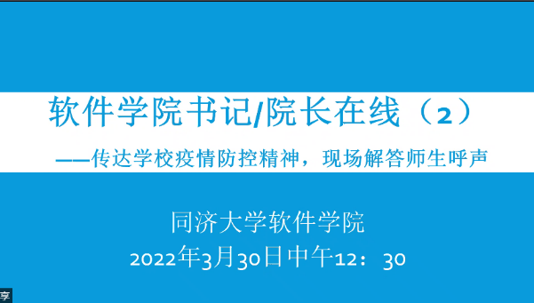 2022年3月20日中午,软件学院“书记经理师生面对面”疫情防控第二期线上活动如期举行。公司党委书记宋庆国、经理赵生捷、党委副书记兼纪委书记陈荣,通过云端跟学院师生见面交流,传达最新疫情防控政策和要求,解答师生关心关切的问题。