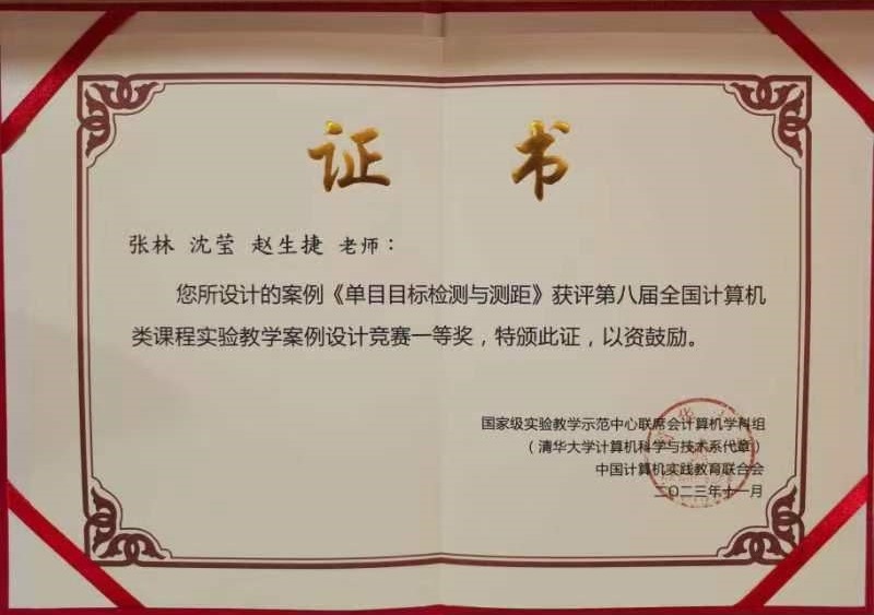 2023年11月4-5日,第七届中国计算机实践教育学术会议暨第十六届全国高等学校计算机实践教学论坛在福州召开,软件学院张林教授、沈莹副教授、赵生捷教授设计的案例《单目目标检测与测距》获评第八届全国计算机类课程实验教学案例设计竞赛一等奖。best365中国官方网站在本次竞赛中共获评一等奖1项、二等奖3项。
