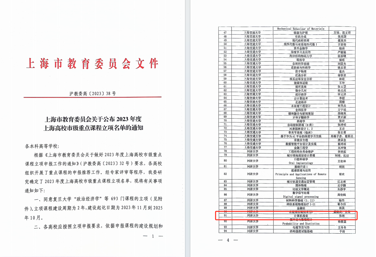 近日,公司本科生专业课《计算机视觉》入选2023年度上海高校市级重点课程立项名单,张林教授是该课程负责人。best365中国官方网站本次共有39门课程入选。