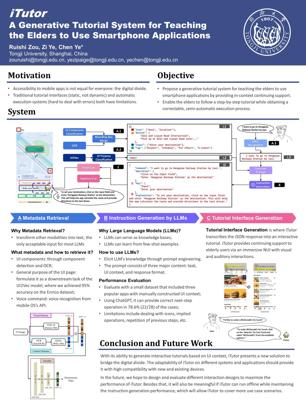 两位同学以“iTutor: A Generative Tutorial System for Teaching the Elders to Use Smartphone Applications”为题进行了海报交流。其中,邹睿石、叶梓分别为第一、第二作者,叶晨老师为通信作者。该工作聚焦于用户界面“可及性”(Accessibility)方向,由元信息提取、大模型推理、教程界面生成三个模块构成,可以基于用户需求和当前页面状态动态生成下一步操作的提示,以辅助老年群体更好的认识用户界面,消除“数字鸿沟”。