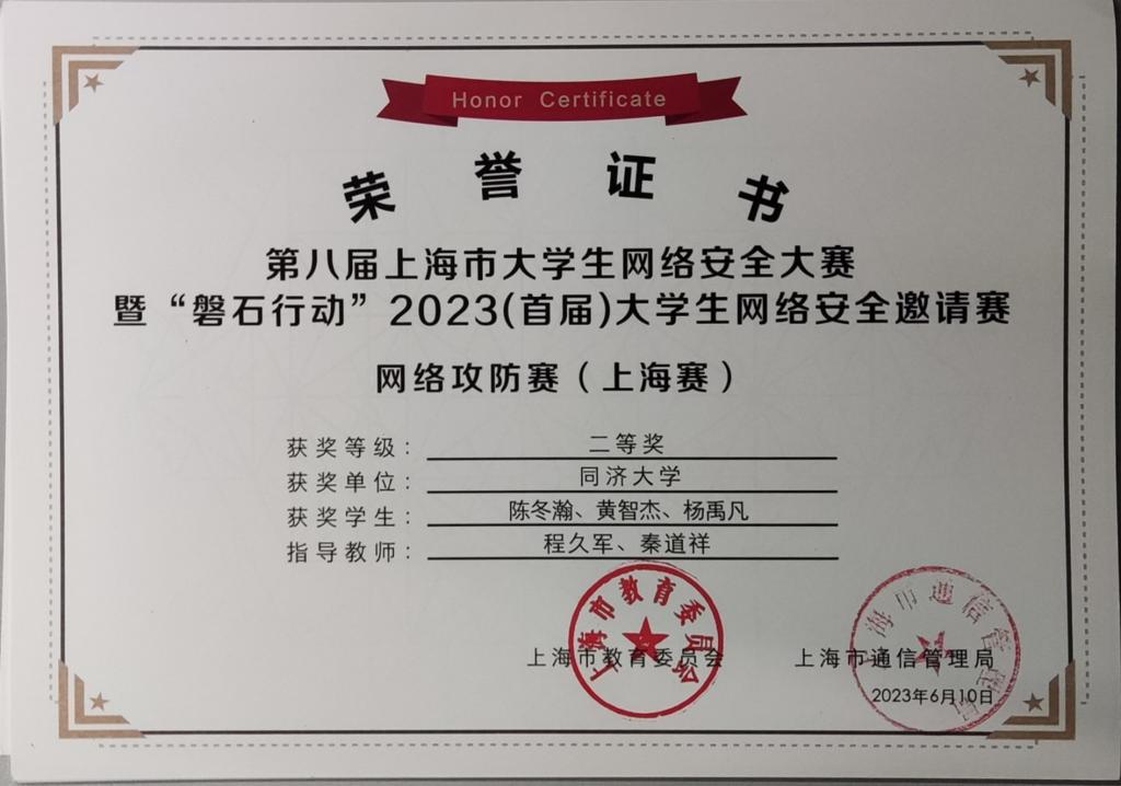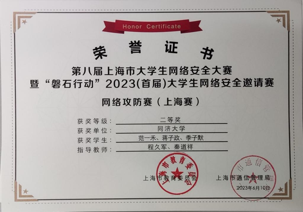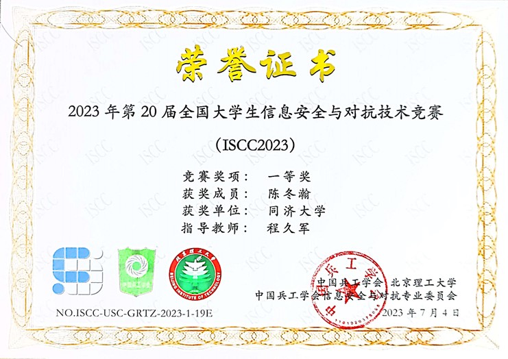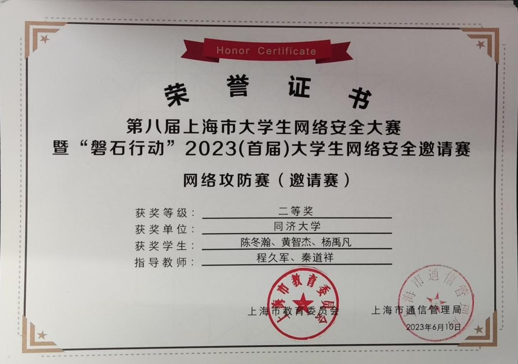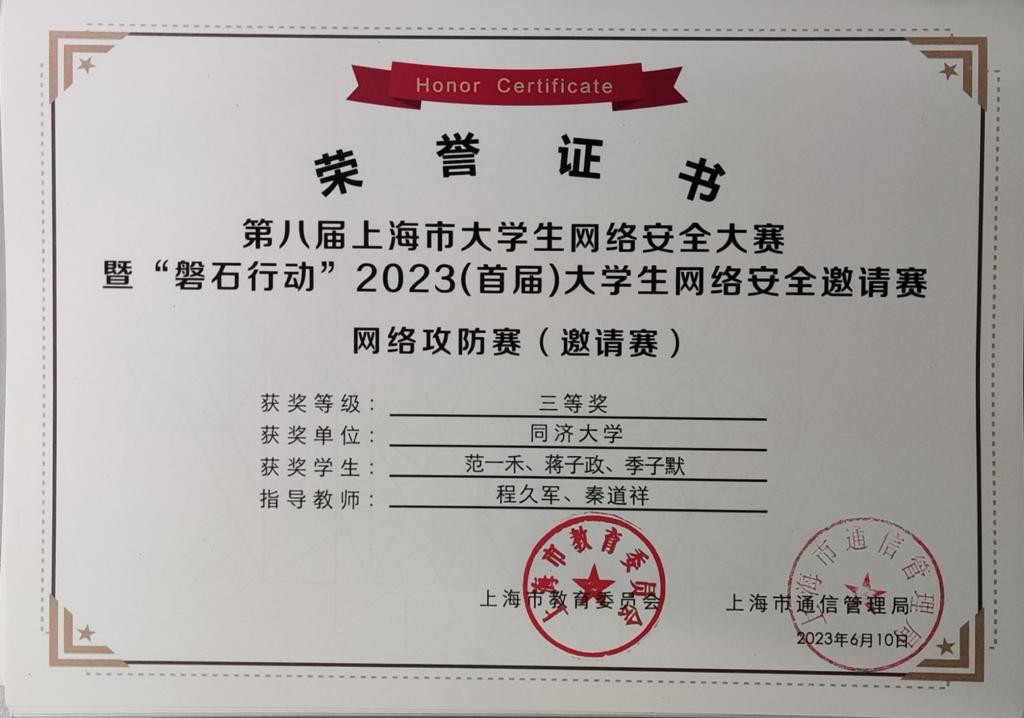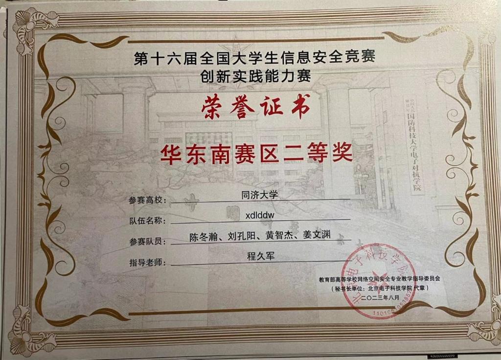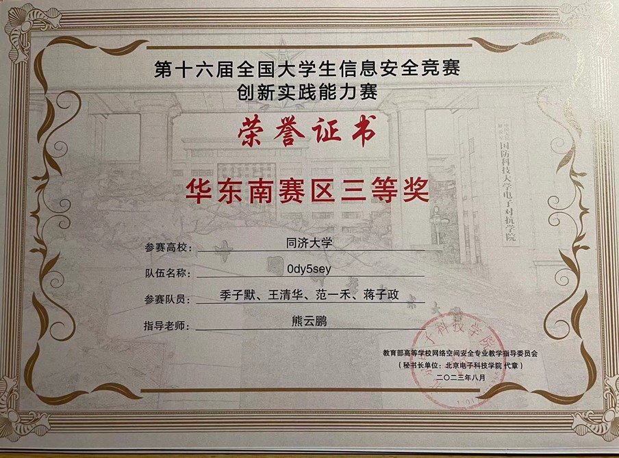 2023年,在学院创新基地信息安全实验室的支持下,在我系程久军教授、校信息办秦道祥及熊云鹏老师的指导下,best365中国官方网站网络安全战队CatTrainingForce的成员们分别在各类信息安全比赛中取得了优异成绩:2023第20届全国老员工信息安全与对抗技术竞赛(一等奖:陈冬瀚;三等奖:季子默);第16届全国老员工信息安全竞赛华东南分区网络安全攻防技术赛(二等奖:陈冬瀚、刘孔阳、姜文渊、黄智杰;三等奖:季子默、蒋子政、范一禾、王清华);第八届上海市老员工网络安全大赛暨“磐石行动”2023(首届)老员工网络安全邀请赛网络攻防赛(上海赛)(二等奖:陈冬瀚、杨禹凡、黄智杰;二等奖:季子默、蒋子政、范一禾);第八届上海市老员工网络安全大赛暨“磐石行动”2023(首届)老员工网络安全邀请赛网络攻防赛(邀请赛)(二等奖:陈冬瀚、杨禹凡、黄智杰;三等奖:季子默、蒋子政、范一禾)。( 文/陈冬瀚 图/季子默 )