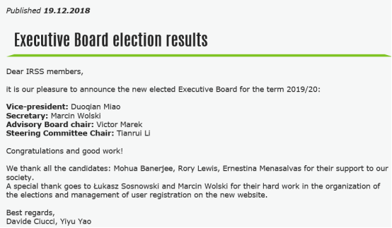 日前,2018年底启动的国际粗糙集学会换届选举结果(每两年一次)正式揭晓。经过国际粗糙集学会全体会员无记名投票选举,我系苗夺谦教授从候选人中脱颖而出,成功当选第九届国际粗糙集学会副理事长(每届只设一位副理事长)。